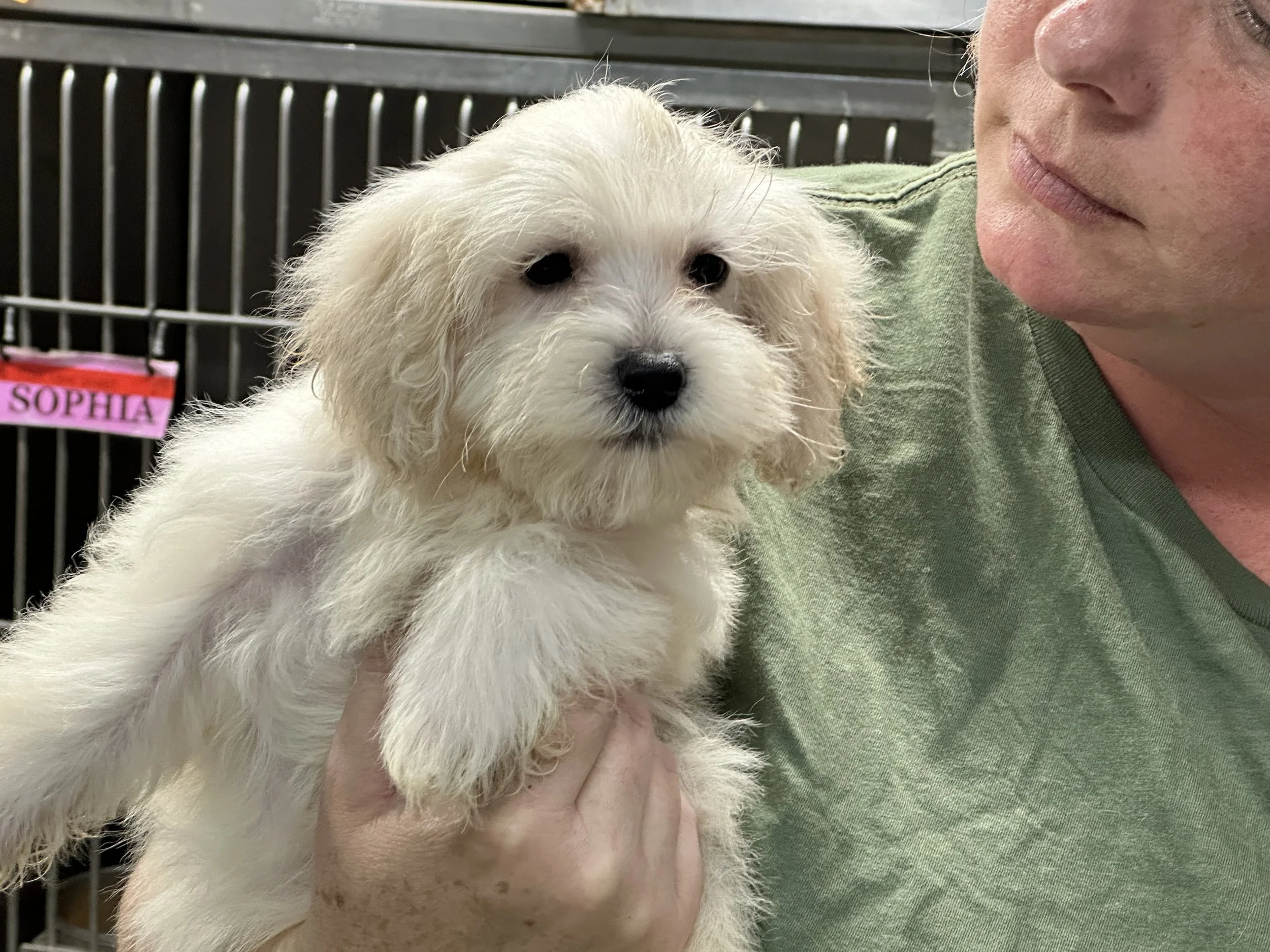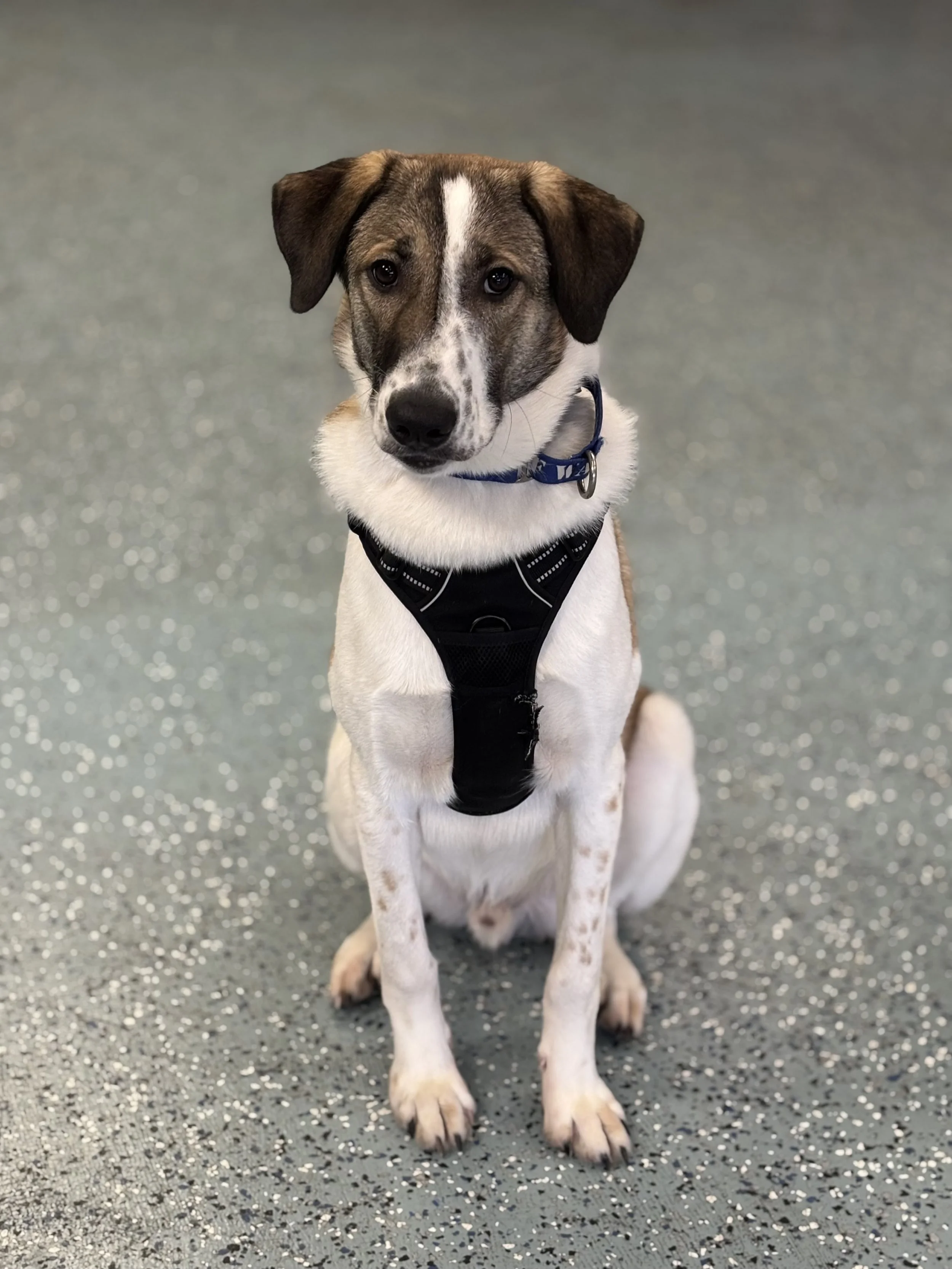 Snow has a beautiful white coat with a couple of tan spots. She has a very sweet disposition. Born on 1/8/25, she was rescued overseas through our War-Torn Pups and Cats program, and is now looking for a home and family of her own.