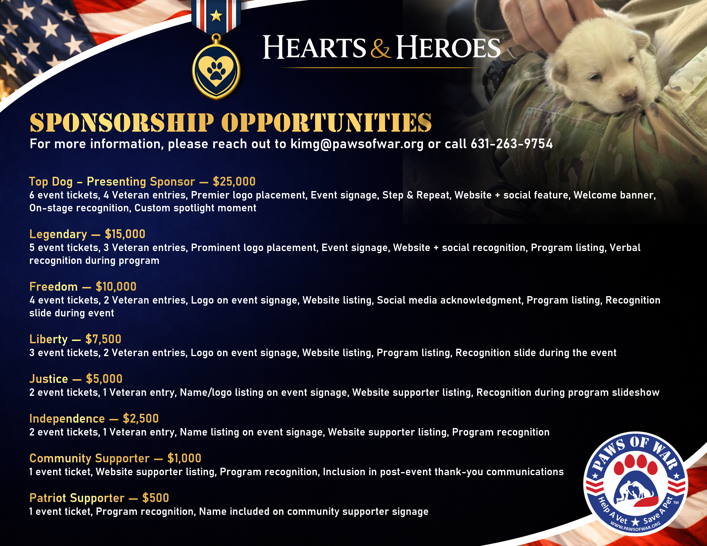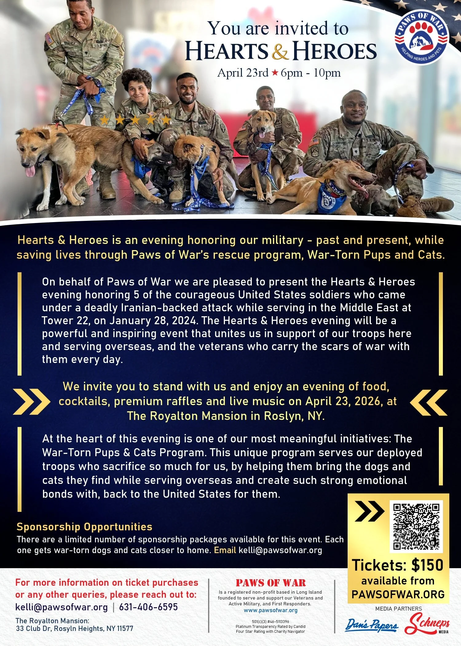 Join us for an unforgettable evening celebrating courage, compassion, and the unbreakable bond between our nation’s heroes and the animals who stand beside them. Hearts and Heroes honors the lifesaving work of Paws of War, whose mission is to support veterans, first responders, and their families through service dogs, emotional support animals, and life-changing programs that restore hope, healing, and independence.