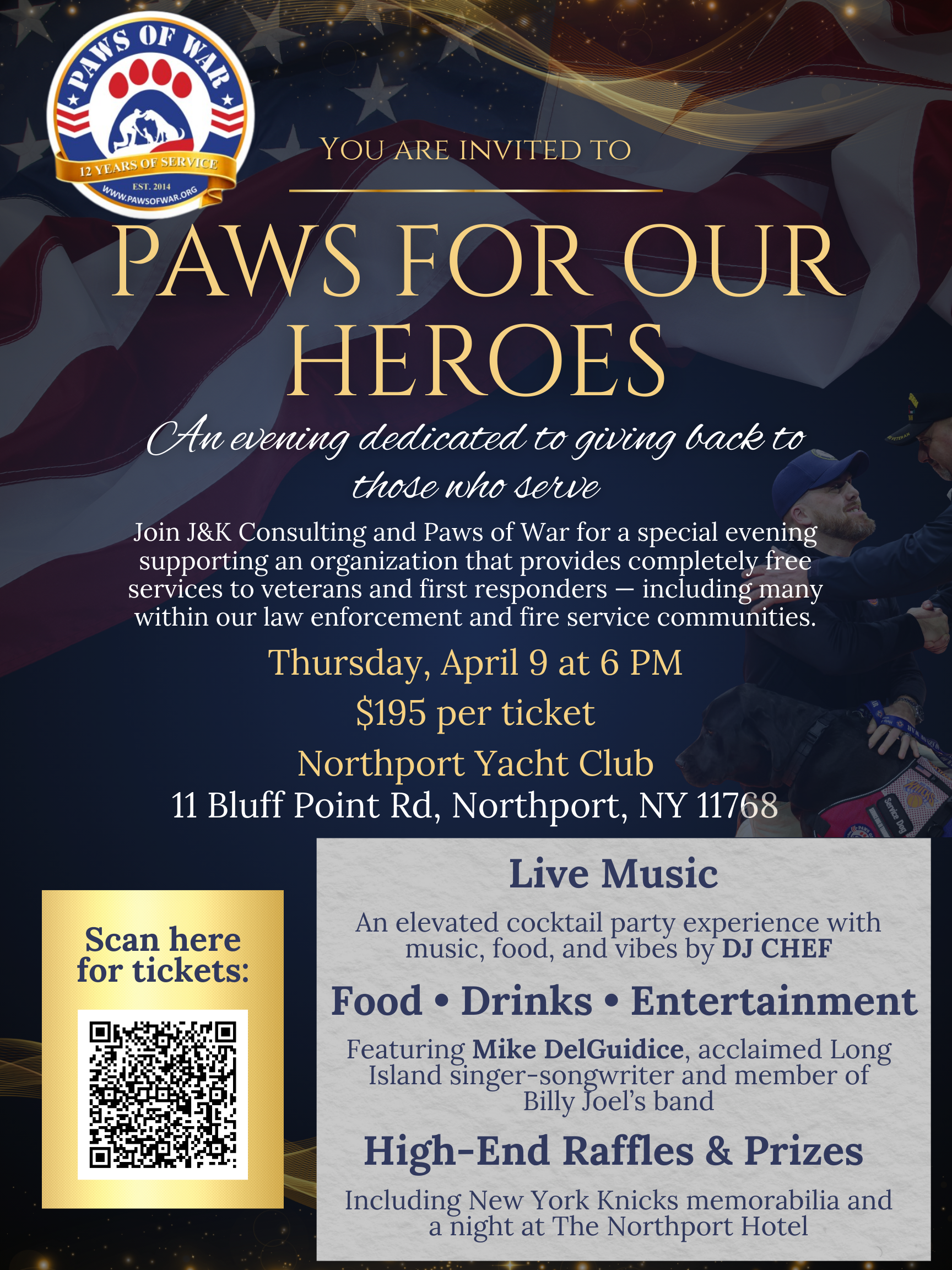 You are invited to an elevated cocktail party dedicated to saving lives, and giving back to our heroes. Join us for an evening of community and entertainment, with Long Island’s acclaimed Singer-Songwriter, and member of Billy Joel’s band, Mike Delguidice. You’ll also experience the ultimate mix of food, music, and vibes, by DJ Chef.