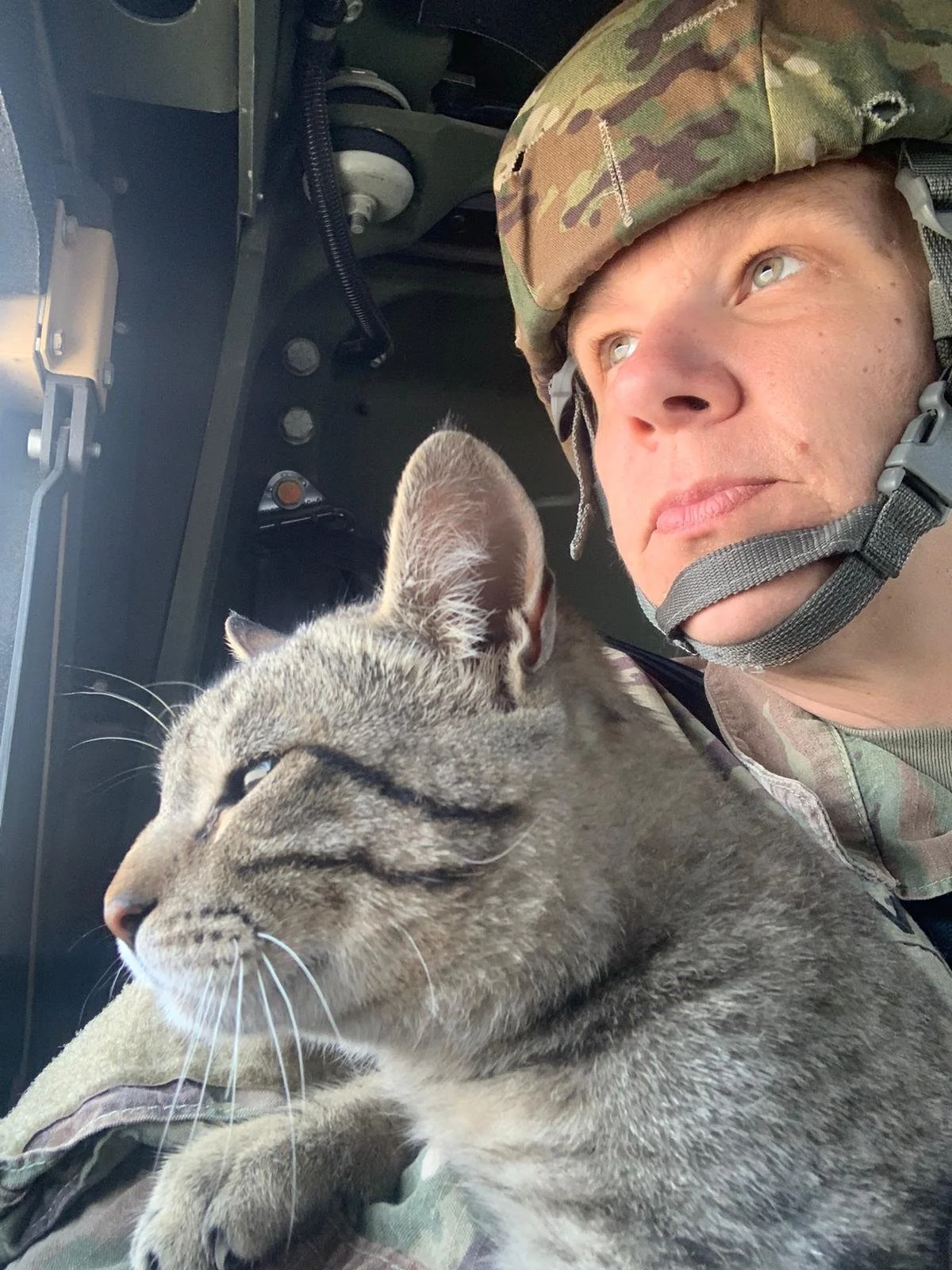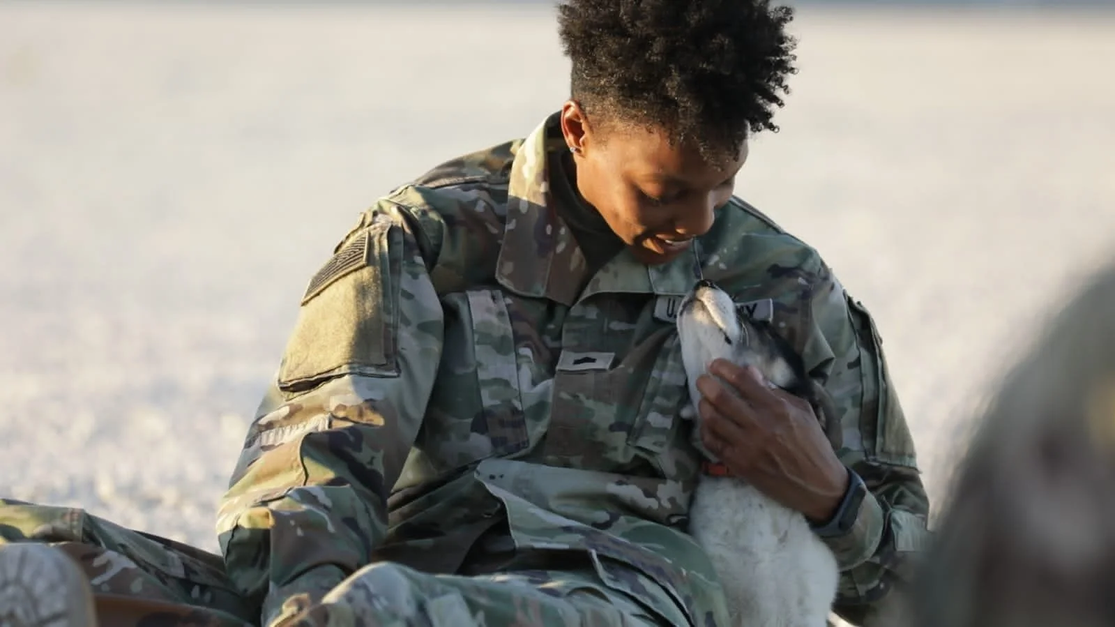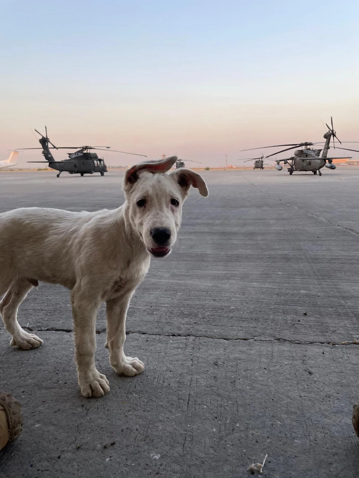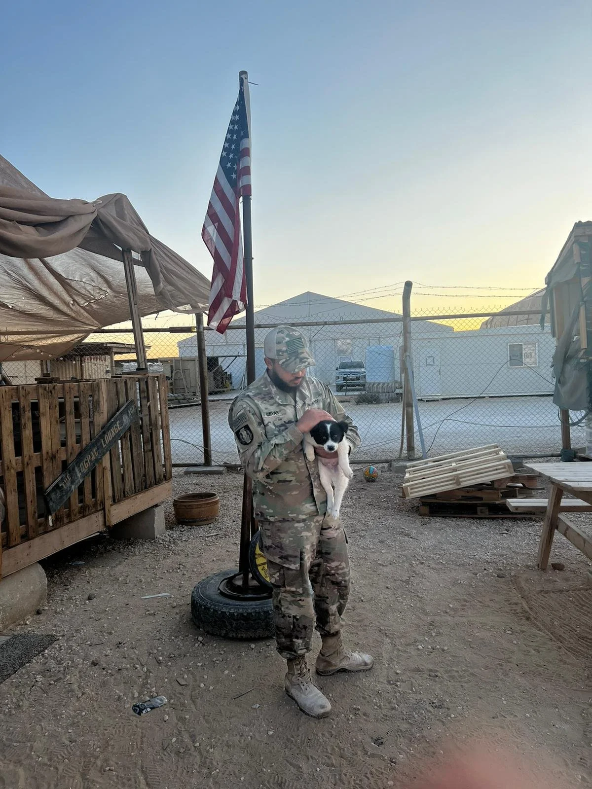 Show the animal is clearly on a base overseas (ie. military equipment in the photo).